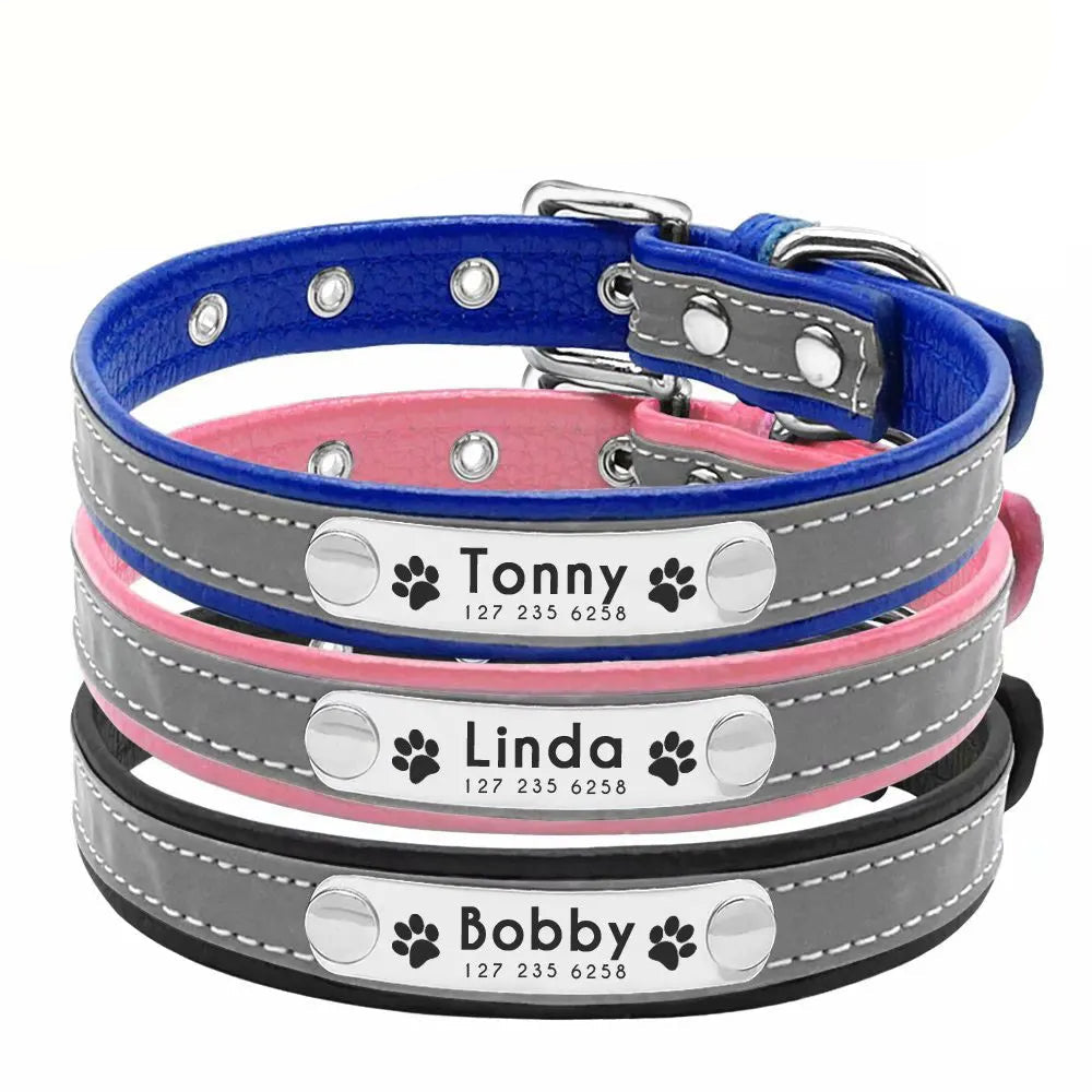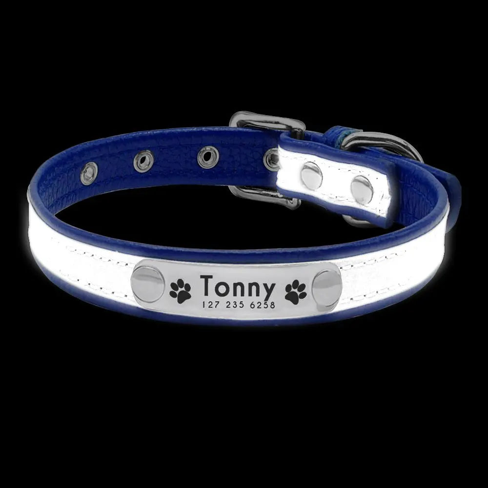 Ein robustes und bequemes Nylonhalsband mit reflektierenden Details, perfekt für nächtliche Spaziergänge. Personalisieren Sie es für zusätzliche Sicherheit mit dem Namen und der Telefonnummer Ihres Hundes.