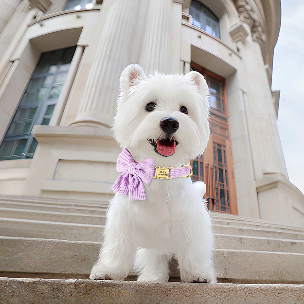 Deze fluweelzachte halsband met schattige strik is niet alleen een eyecatcher, maar ook praktisch. Met de naamgravure en telefoonnummer weet iedereen waar jouw hond thuishoort.